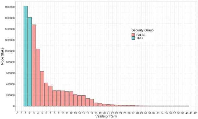 However, this requirement may not be initially satisfied at the border between the security group nodes and the non-security group nodes. As an example of this scenario, the delegation from the Foundation, as initially calculated as an equal portion of the total Foundation stake across all non-security group nodes, would lead to the highest-staked node outside of the security group, who receives this delegation, having a total stake greater than the least staked node inside of the security group, which doesn’t receive a delegation. A graphical representation of this situation is shown here: