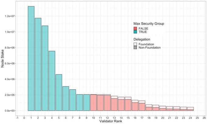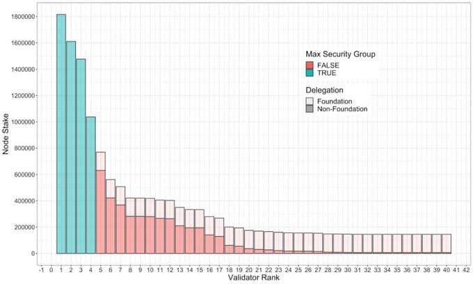 - Identify the minimum set of validator nodes of which cumulative, non-Foundation stake is greater than or equal to this amount. This is the network’s current maximal security group.