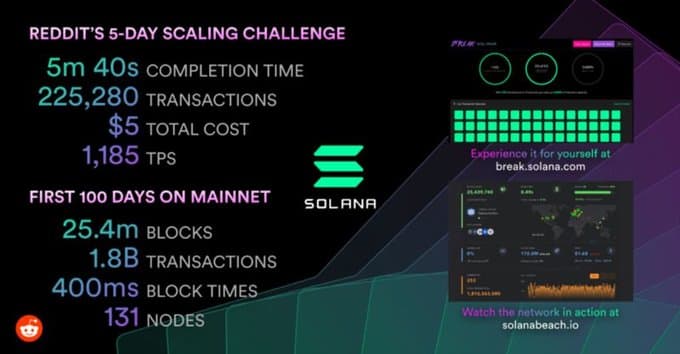 Solana tackled the Scaling Bake-Off the week of July and completed the entire 5-day challenge in around 5 minutes for less than $5 USD. Some highlights: