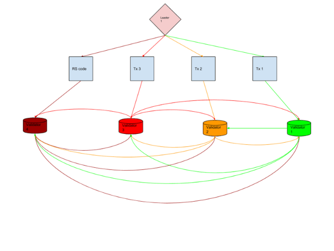 Figure 2. shows how the leader splits the bandwidth between downstream nodes. The leader sends a packet up to 64kb in a round robin fashion to each validator in the first layer. That validator immediately broadcasts it to everyone else in the first layer of the network. This should pipeline the transmission of the second packet from the leader to validator 2 with the broadcast of the first block from validator 1 to the rest of the network.