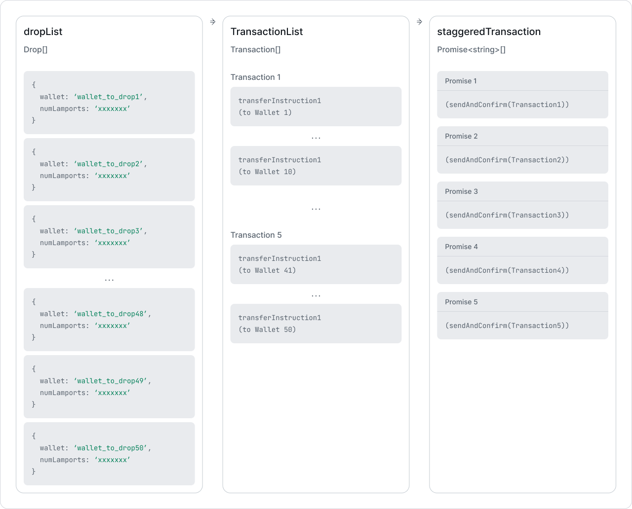 This means you can pack multiple transfers into a single transaction. Instead of sending three separate transactions to pay three recipients, you send one transaction with three transfer instructions. This is faster (one confirmation instead of three) and cheaper (one base fee instead of three). Here's an illustrative example of how payments (referred to as "drops" in this image) are batched into a single transaction and multiple transactions are sent to handle the larger batch.