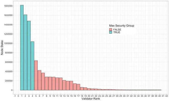 The maximal security group is defined as the largest security group that can be created, given the strategic delegation of the Foundation’s tokens across eligible nodes on the network outside this group. The algorithm to identify this group is as follows: