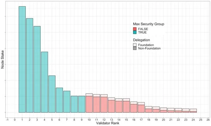 However, this requirement may not be initially satisfied at the border between the security group nodes and the non-security group nodes. As an example of this scenario, the delegation from the Foundation, as initially calculated as an equal portion of the total Foundation stake across all non-security group nodes, would lead to the highest-staked node outside of the security group, who receives this delegation, having a total stake greater than the least staked node inside of the security group, which doesn’t receive a delegation. A graphical representation of this situation is shown here: