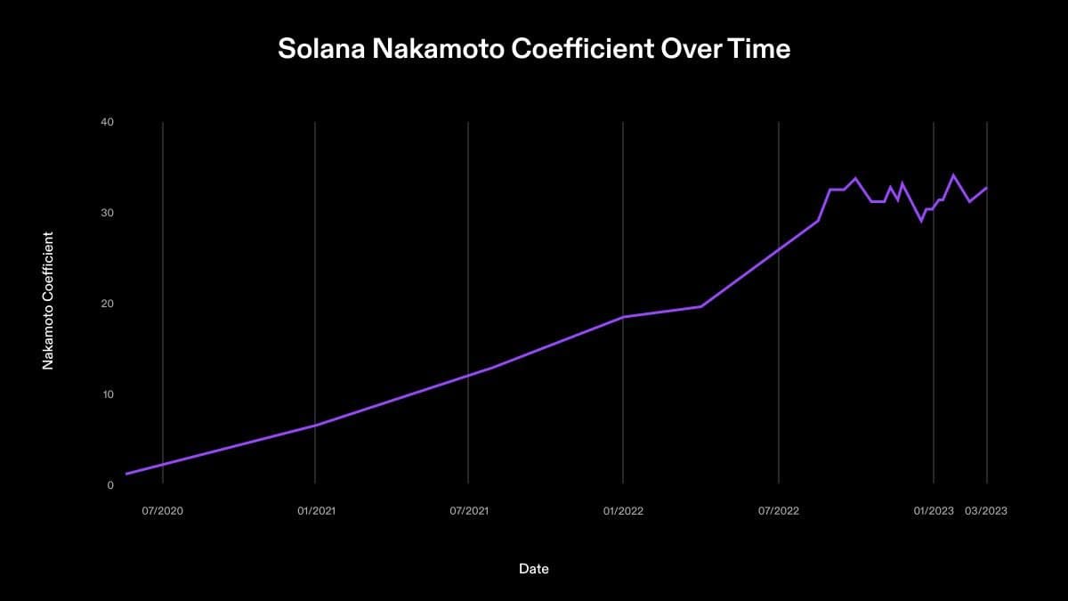 Solana’s the Nakamoto Coefficient grew steadily from the chain’s launch in March 2020 through September 2022 and has remained relatively stable since then.