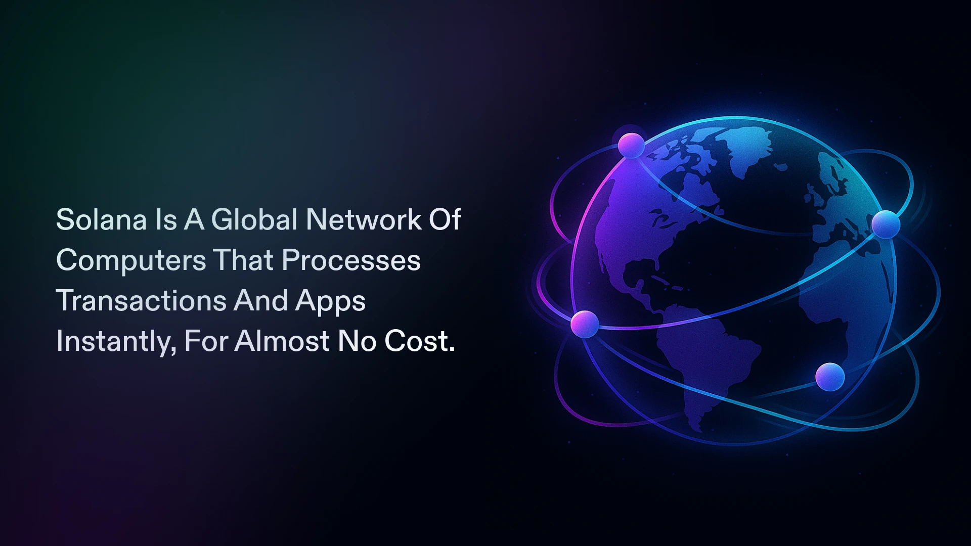 Solana as a global network of computers with nodes connected worldwide processing transactions instantly