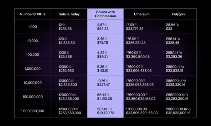 With state compression, NFT minting costs increase with scale, not linearly. Minting 100,000 NFTs costs $103, and a million NFTs (ten times the original amount) for only $30 more.