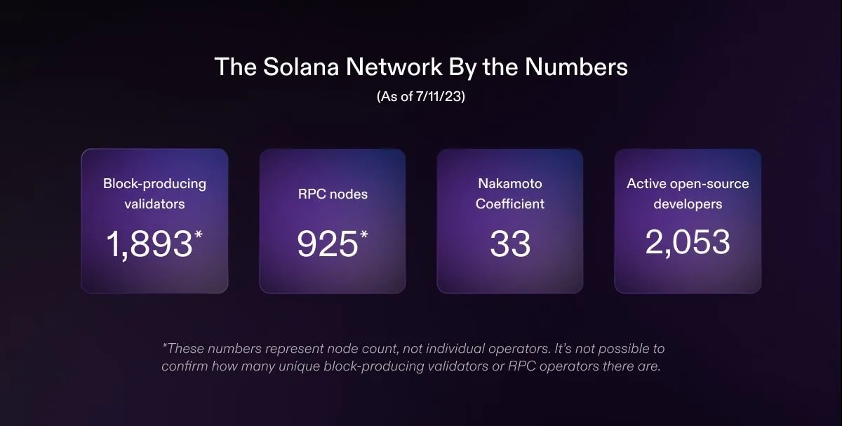 The network continues to be run by a robust group of independent validators around the world. It’s one of the world’s most decentralized proof-of-stake blockchains, and one of the most developed on. Below, we’ve included a few statistics the Solana Foundation tracks to measure the decentralization and vitality of the Solana network (updated as of 7/11/23):