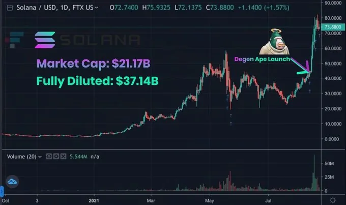 There are direct reasons that the Apes drove up the price. People needed to buy SOL to buy Apes, and at ◎ 6 per Ape, the launch locked up 60,000 SOL. Once people bought SOL and experienced the speed and low transaction costs for themselves, they got more bullish.