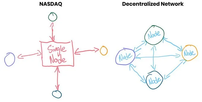 A centralized exchange like NASDAQ is a single node through which all of its participants’ data is routed. Someone trading on the NASDAQ pays to do so, and gets a machine set up at the NASDAQ that’s connected by ethernet cables exactly the same length as all other participants’, so that they can receive price information and submit orders at exactly the same speed as everyone else. As Anatoly said on Acquired, “Your information gets to the markets at the same speed as everyone else. That's censorship resistance.”