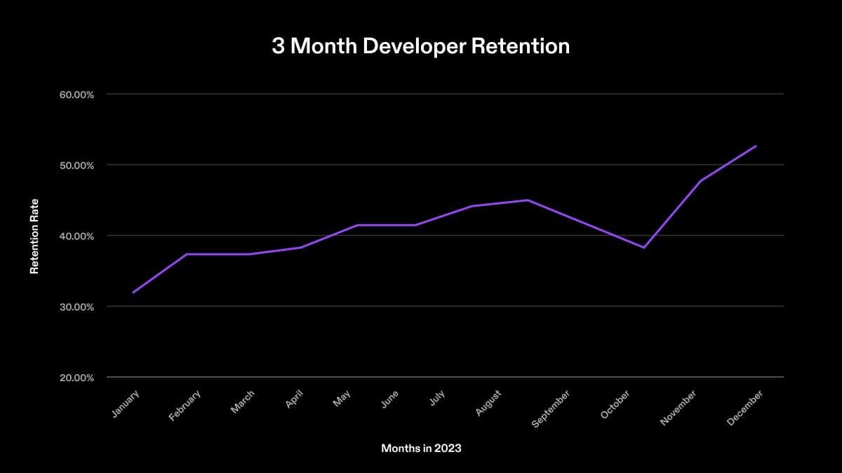 Over the course of 2023, 3 month developer retention within the Solana ecosystem has increased from 31% to >50%, keeping more developers that join in the ecosystem. This retention increase may be the result of a few reasons: