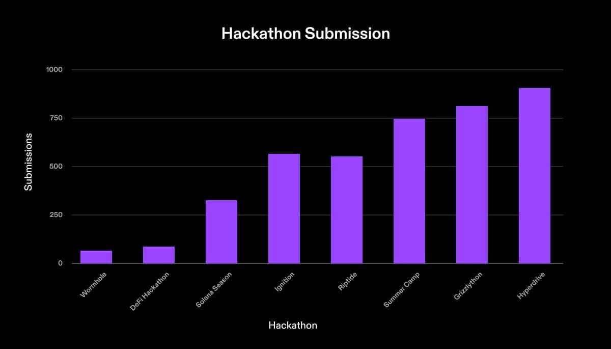 We expect the Solana Hackathons to be a top indicator for the health of the developer ecosystem. There have been eight Solana Foundation-sponsored hackathons since 2020. Over the past three years, more than 3000 projects have launched and over $600 million in funding has been raised for projects submitted to the hackathons. With each hackathon, the number of project submissions has increased. The most recent hackathon, Solana Hyperdrive, had more than 900 submissions.