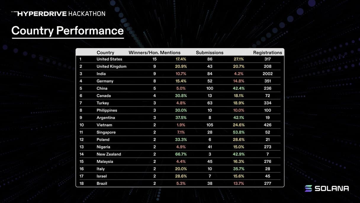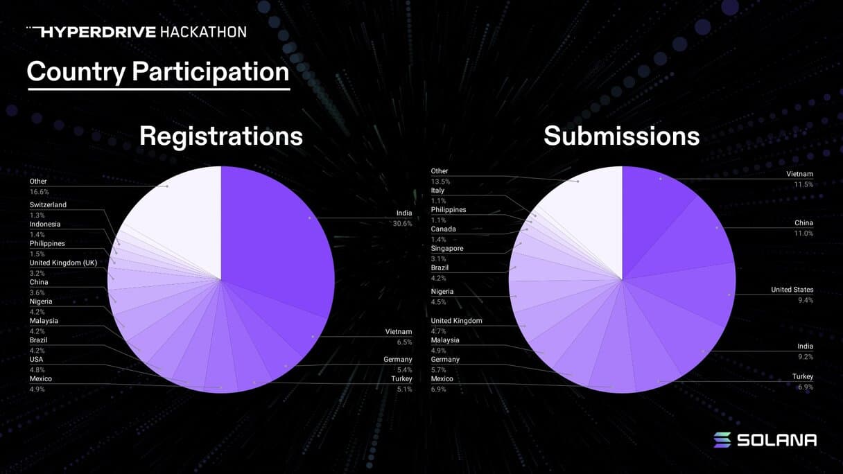 The Solana Foundation’s most recent hackathon, Hyperdrive, saw 151 countries represented among participants. Of those, participants from 65 countries made final submissions.