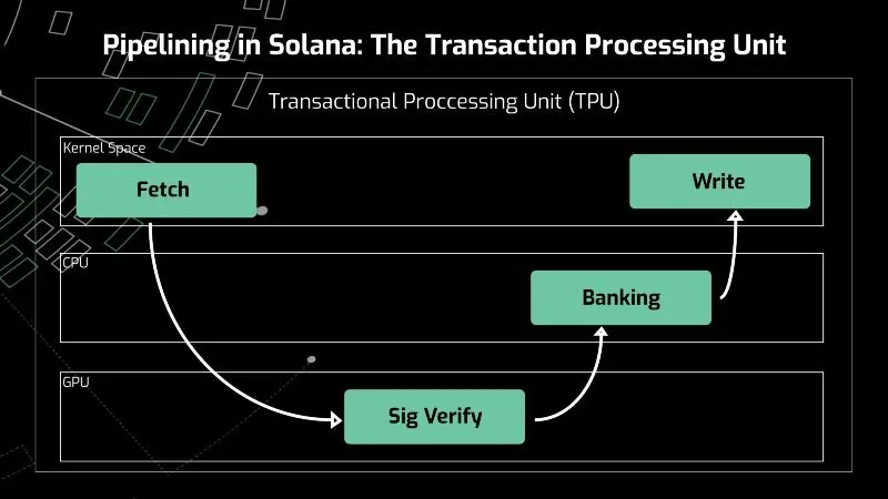 On the Solana network, the pipeline mechanism — Transaction Processing Unit — progresses through Data Fetching at the kernel level, Signature Verification at the GPU level, Banking at the CPU level, and Writing at the kernel space. By the time the TPU starts to send blocks out to the validators, it’s already fetched in the next set of packets, verified their signatures, and begun crediting tokens.
