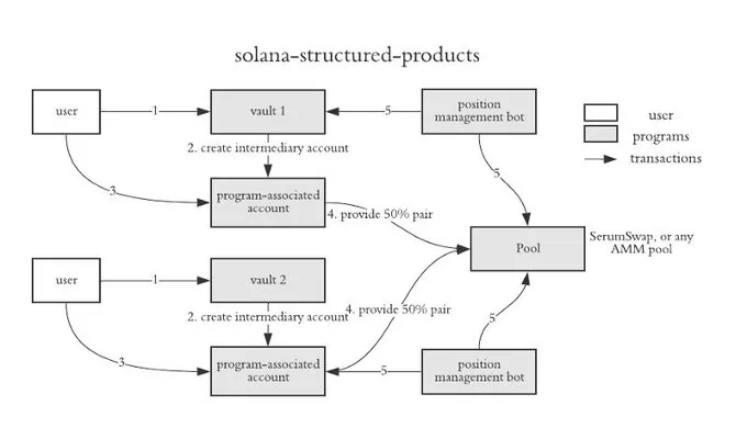 Structured products in traditional finance are simply a combination of two or more financial instruments that comprise a single product that pays out based on the underlying assets’ performance. The Structured Products team built a system that allows users to match and lock single deposits with the shared goal of executing a particular trading strategy, coupled with position management bots that read and respond to Serum DEX’s market data.