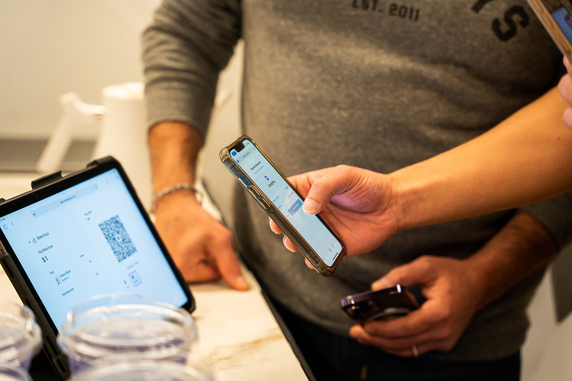 A customer using a QR code to purchase drinks from Boba Guys at an NFT NYC event, 2023. Photo courtesy of the Solana Foundation.