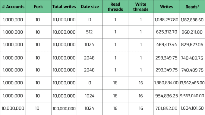 While the Accounts database is in RAM, we see throughput that matches RAM access times, while scaling with the number of available cores. At 10m accounts, the database no longer fits in RAM. However, we still see performance near 1m in reads or writes per second on a single SSD.