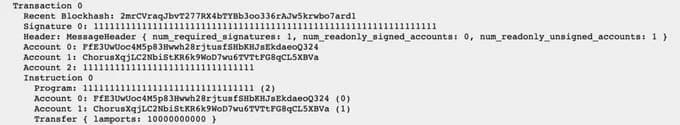 Where Account 0 is our Solana Bootstrap Validator, and Account 1 is Chorus One’s Validator. Notice also the transaction signature of almost all 1’s (format is in Base58) which almost never happens and is highly irregular. And of course, the last line, which highlights the bogus transaction of 10 SOL (or 10 billion lamports) from one to the other.