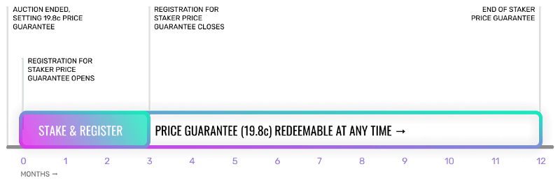 Starting on June 20th, 2020, Solana will no longer accept all wallet addresses to be registered for the Staker Price Guarantee, but require that new registrants provide a stake account address in order to register. To be eligible for redemption, the original program rules for staking have not changed. A registered stake account must be continuously delegated for at least 48 hours from the time of registration to the time of redemption to be eligible for the guaranteed price.