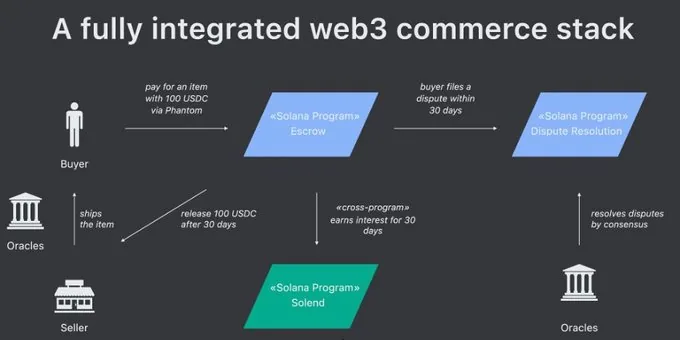 - Yield generation for escrow funds in Solend: While funds are held in the escrow smart contract, it can be deposited at Solend to earn yield for the seller and buyer. For the first time, sellers and buyers don’t have to pay fees to intermediaries; they now get paid. This feature in particular illustrates the composability of building one onchain feature into another onchain feature, an advantage of the single state of Solana.