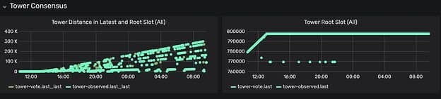 If you refer to the diagram below, this is how the cluster reacts when this attack is performed. The diagram on the left shows an ever-growing gap between the latest block and the last time a block was finalized when a healthy cluster would instead show a flat line. The diagram on the right should look like a linearly increasing function, instead, it’s a flat line indicating that consensus isn’t being achieved.