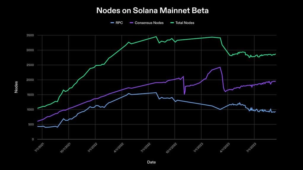 In March 2023, total consensus nodes dropped from around 2200 to roughly 1700: this drop was due to a large amount of stake that was redelegated away from nodes that were charging 100% commission. The stakeholder recognized the issue and reallocated their delegation to more active validators. After this drop, and as of Sept. 13, consensus nodes have slowly and steadily grown upwards, reaching 1,961 consensus nodes and 2,874 validator nodes total.
