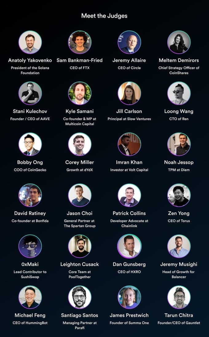 Projects were judged based on the following five categories: Functionality, potential impact, novelty, design, and composability. While participants were encouraged to build novel DeFi apps, hackers could build infrastructure or any tool they believed would have an impact on the DeFi ecosystem. The only requirement was that teams must incorporate Solana or Serum into their project.