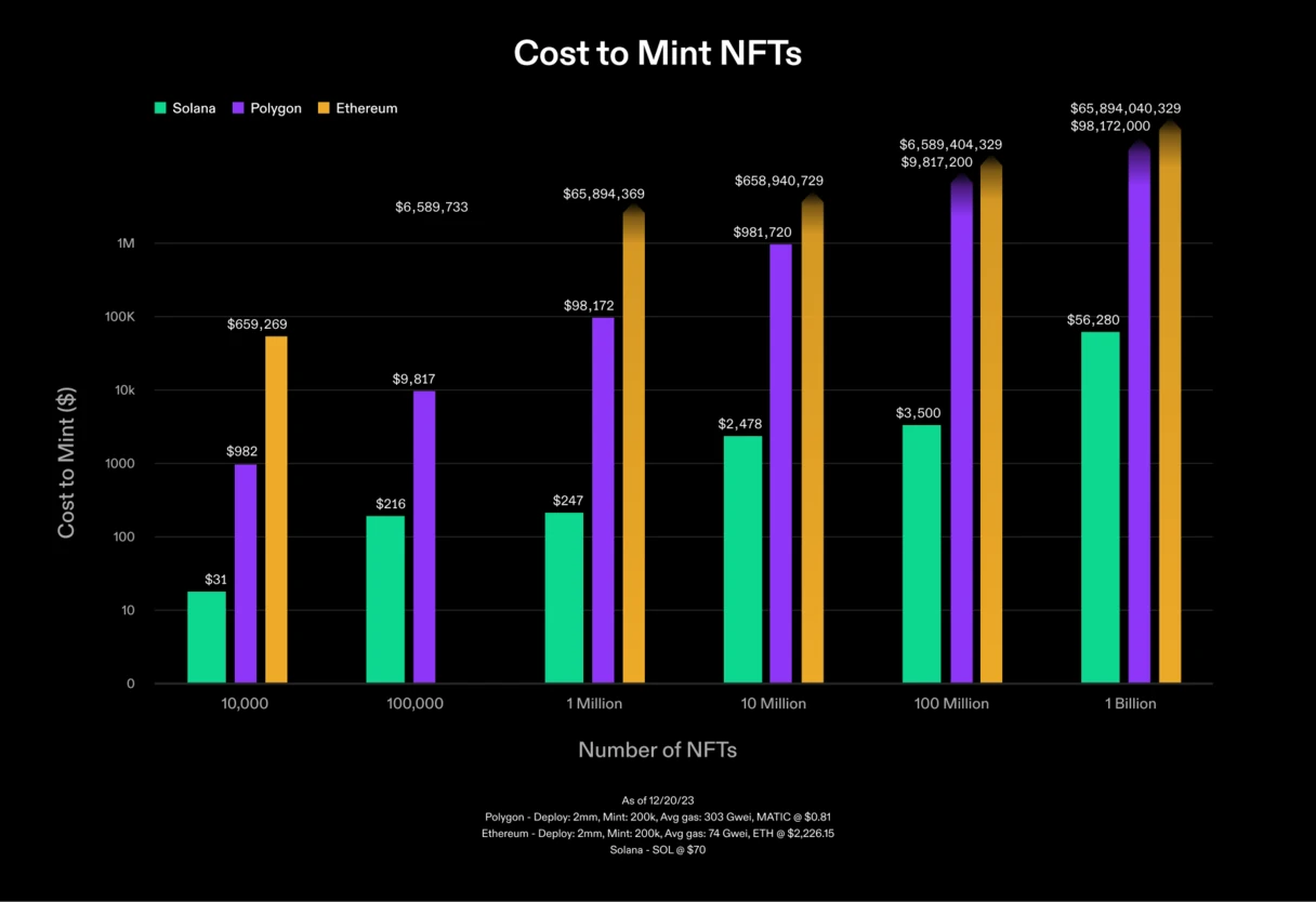 Now, seven months after the announcement of compressed NFTs, the Solana Foundation has conclusive data on the actual cost of using compression. As of Dec. 20, 2023, any project can use cNFTs to mint one million NFTs for $247.80 (compared to the initial estimates of $113.42 in April 2023) — significantly less than more than $6 million it would cost to mint one million NFTs on Ethereum, or the more than $98,000 it would cost on Polygon.