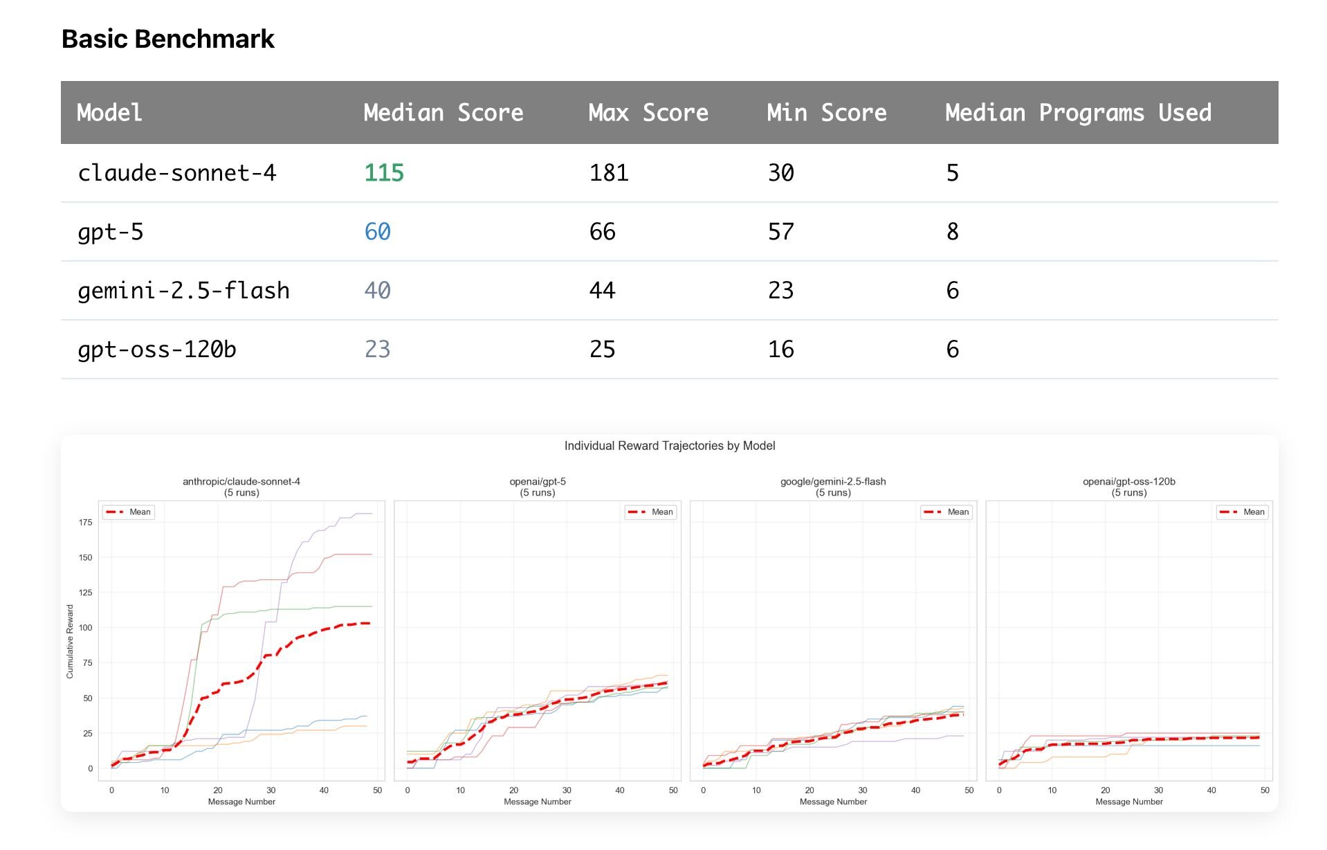 These environments are not about measuring profit and loss. They are about operational Solana competence. These environments reward composing valid transactions, choosing accounts appropriately, using SDKs correctly, recovering from errors, and exploring breadth across programs. These environments are inspired by other open-ended benchmarks like ClaudePlaysPokemon, TextQuest, and Nvidia's Voyager.