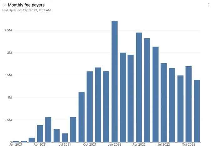 Using unique feePayers as users on Solana, we can see that users peaked earlier this year at 2.7 million. Since then the monthly users have trailed back down to where we were right before the peak.