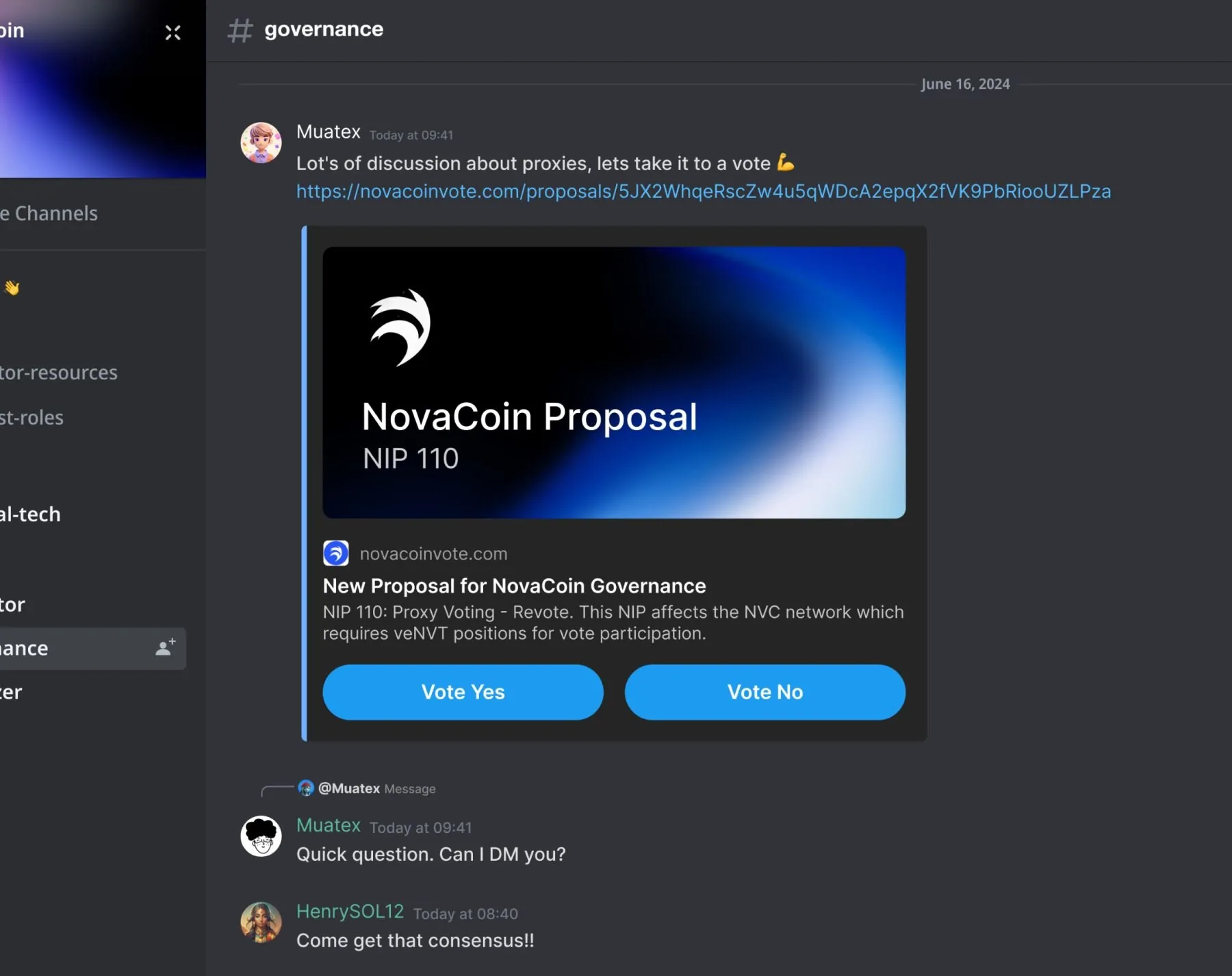A DAO that uses governance tokens sets up a “voting” channel on their chat server of choice (say, Discord). When a proposal is up for a vote, an Action is sent to the voting channel, allowing people to vote via an in-chat poll. The votes are recorded onchain, and once the results are in the proposal executes automatically.