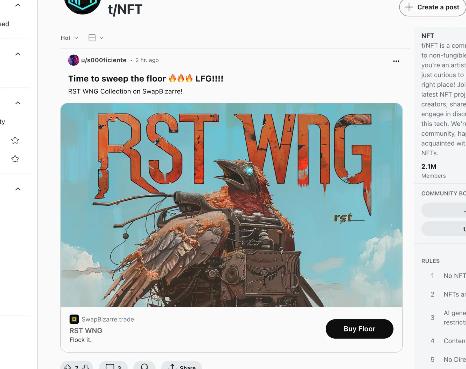 Alice is a fan of RST WNG and owns many of their original works. She goes to Reddit and encourages people there to buy the floor. Using a blink provided by Tensor in a post on Reddit will unfurl into a “buy the floor” button, letting readers execute the transaction within Reddit itself.