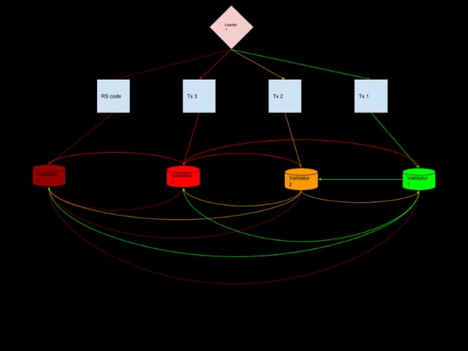 As shown in Figure 1, client messages arrive to the current leader, the leader inserts them into a Proof of History (PoH) stream and broadcasts it out to the rest of the network, which act like validators. The challenge in this design is that the leader can ingest 1 gigabit worth of data and need to somehow produce 1 gigabit worth of output to multiple machines at the same time. It can’t broadcast the full set of data to all the machines because that would add up to more than 1 gigabit. Our approach is to split the bandwidth between downstream validators and have them re-assemble the stream back together.