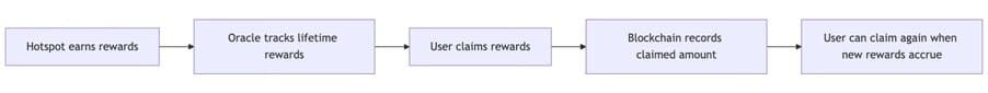 Instead, Helium's system works more like a bank account: oracles track each hotspot's lifetime earnings off-chain, but the blockchain only records what users have withdrawn. When a hotspot owner wants to access their rewards (to stake, sell, or use), they "claim" the difference between their total earned amount and what they've previously claimed.