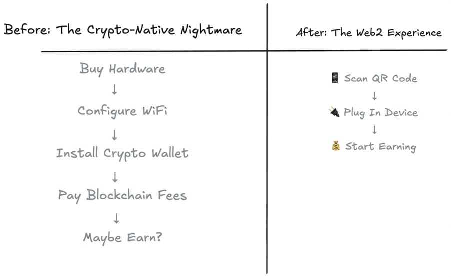 Helium's onboarding has evolved from WiFi-based device setup (painful) to factory pre-signing and QR codes (plug-and-play). Today, users can scan a code, get a wallet, and start earning – no crypto expertise required.