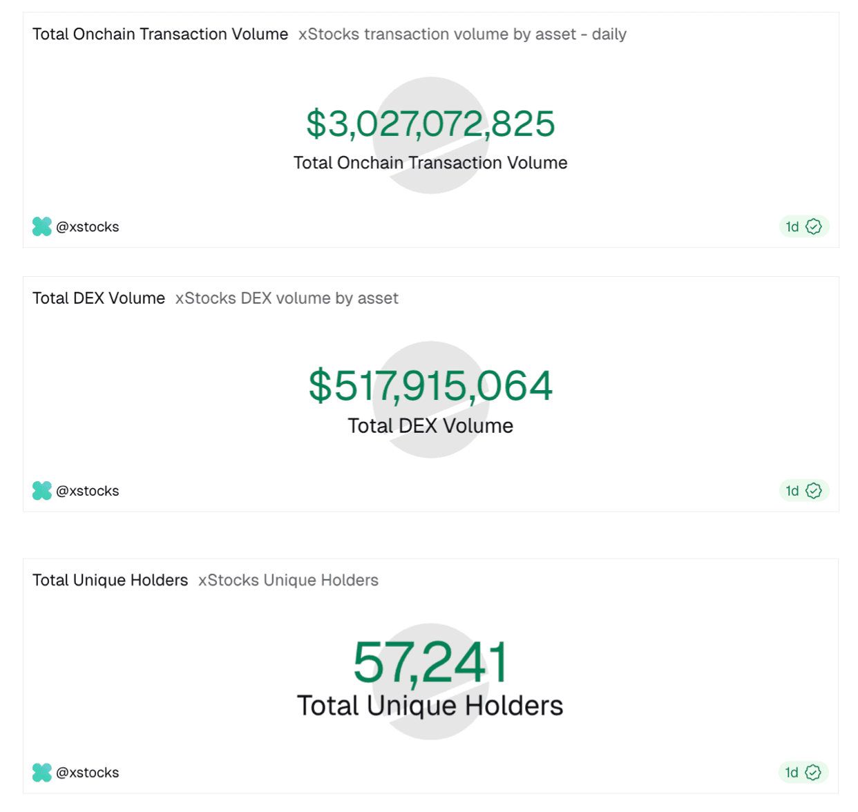 As of Jan 19, 2026, the total onchain transaction volume of xStocks has crossed $3 billion with DEX volume crossing $517 million. Total unique holders have surpassed 57 thousand.